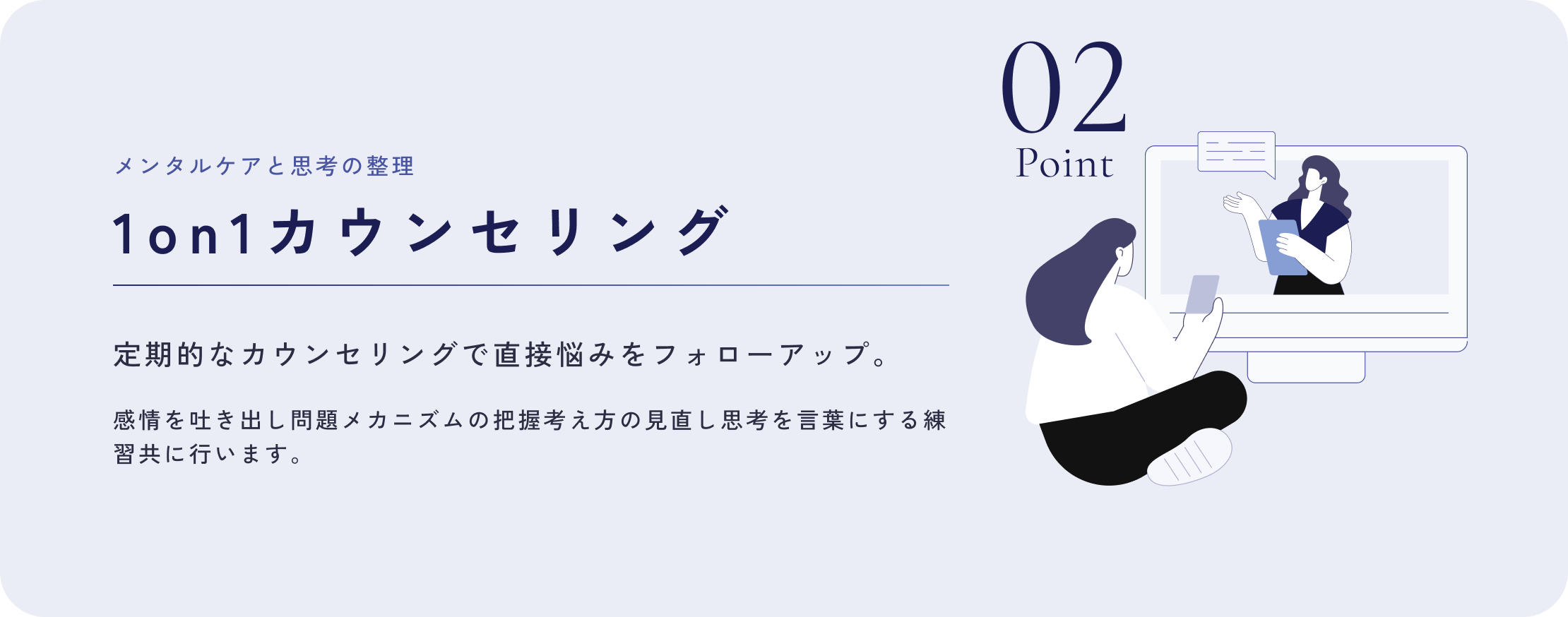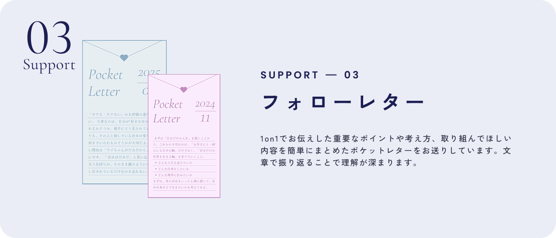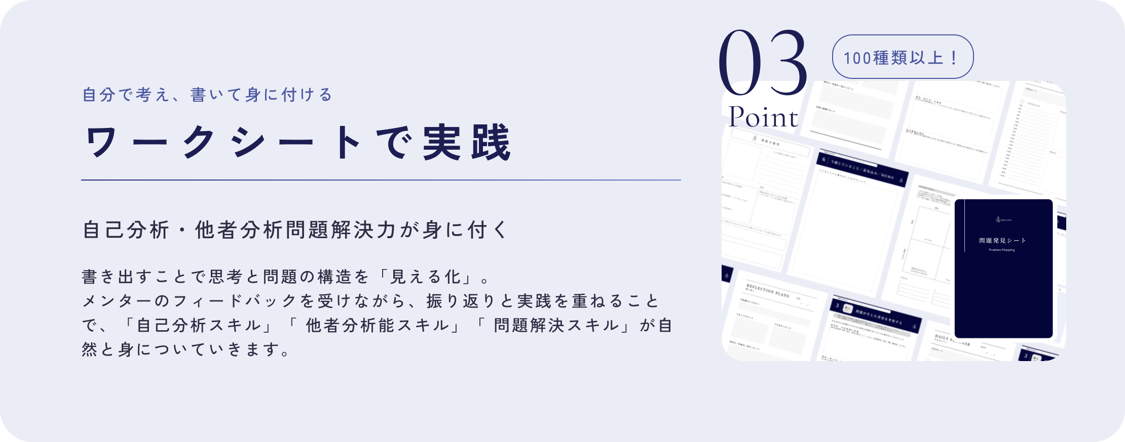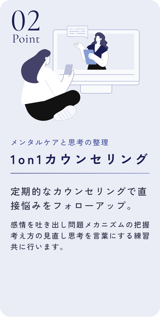 日々の自学習に加え、定期的なカウンセリングで問題の分析、改善のためのワークの実践を行なっていきます。